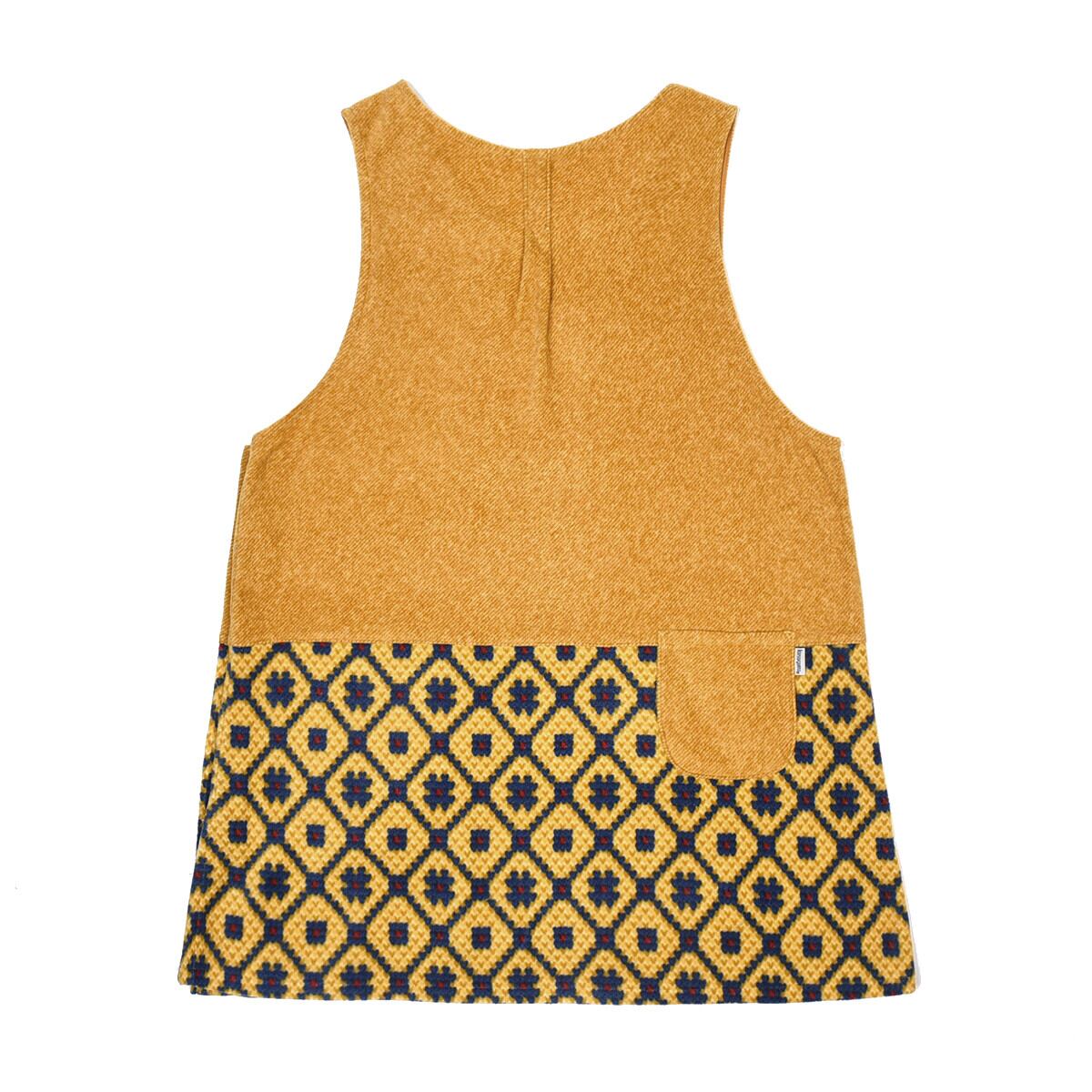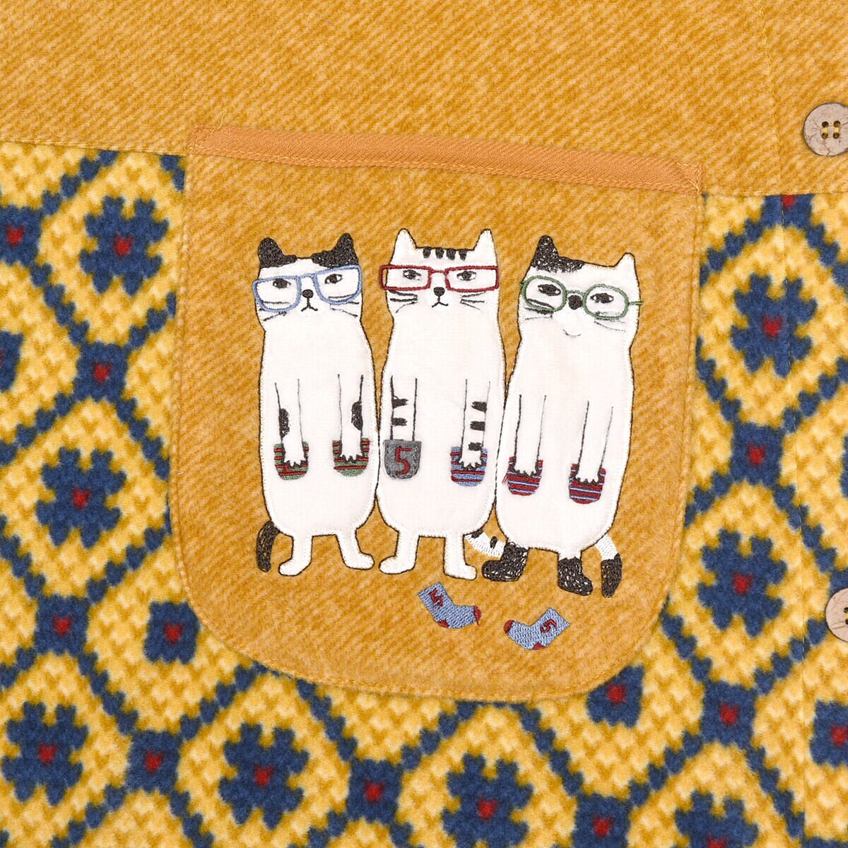 ウエストの切り替えがクスグル定番デザイン。脱ぎ着が楽な脇あきエプロンで大人なイメージです。まるでジャガード織りが入ったかのような味わいがあるフリース。配色のプリント柄はセーターのイメージを思わせるあたたかなモロッコ風の柄をプリントで表現しました。ポケットにはカラフルな眼鏡でよそいき気分のネコまるけのアップリケで飾りました。