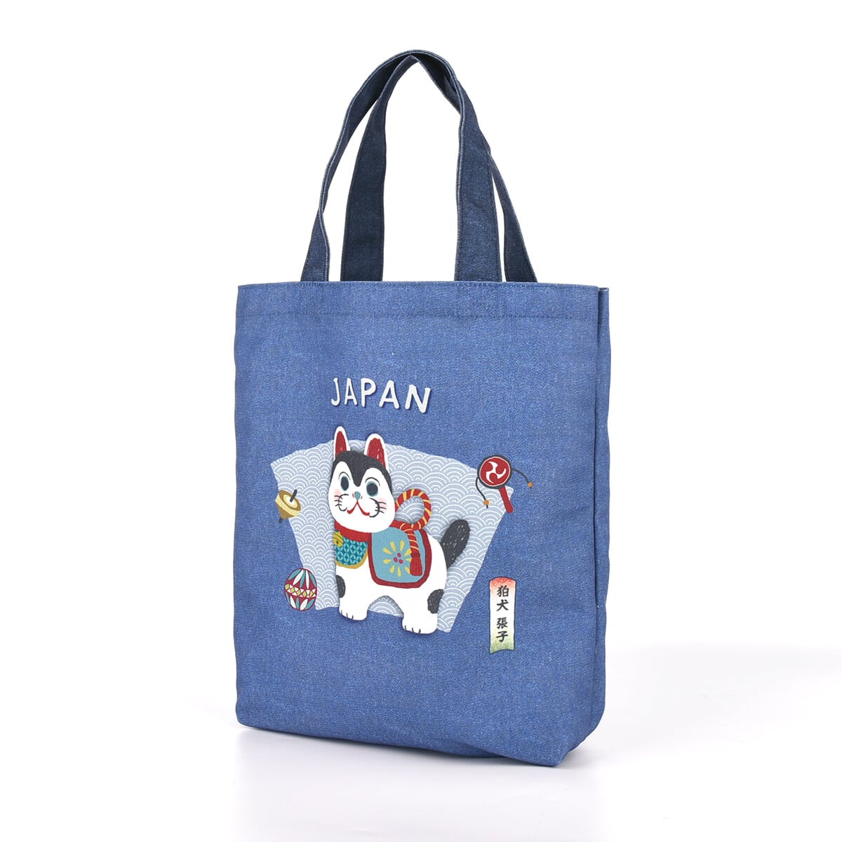 和風テイストのクスグルキャラクター達。表面はデニムのフェイクプリント仕上げ。しっかりしたキャンバス素材使用で、A4サイズの書類がすっぽり入るトートバッグです。