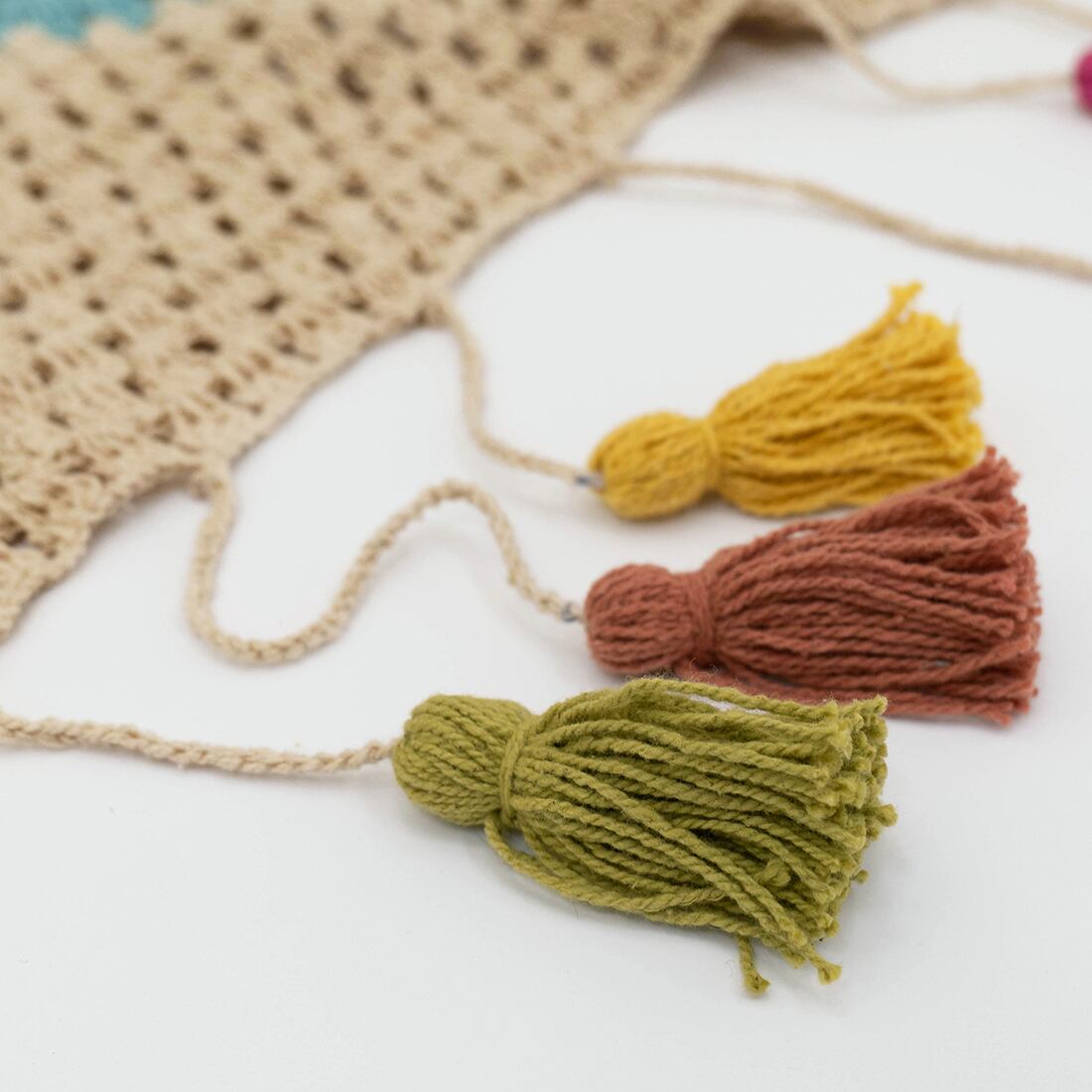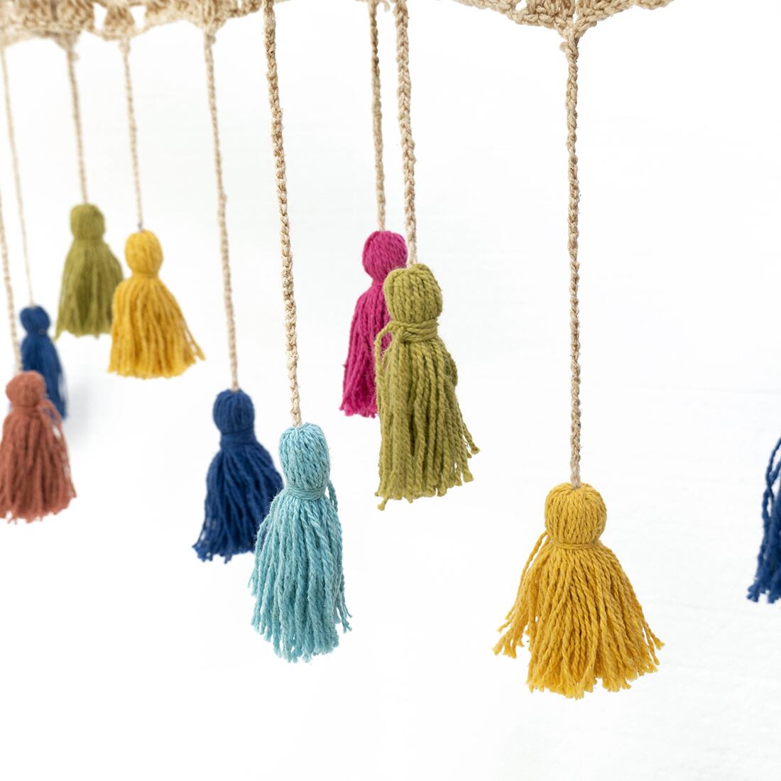 カラフルなクロシェ編みとポップなタッセルが可愛いカフェカーテン。