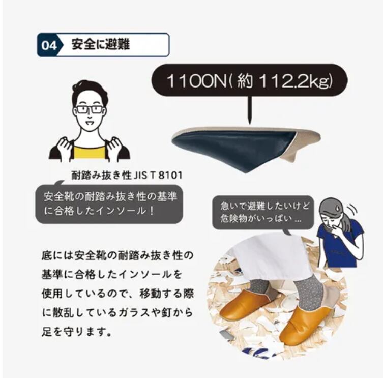 底には耐踏み抜き性の基準に合格したインソールが入っているので、非常時には防災スリッパとして足を守ります。