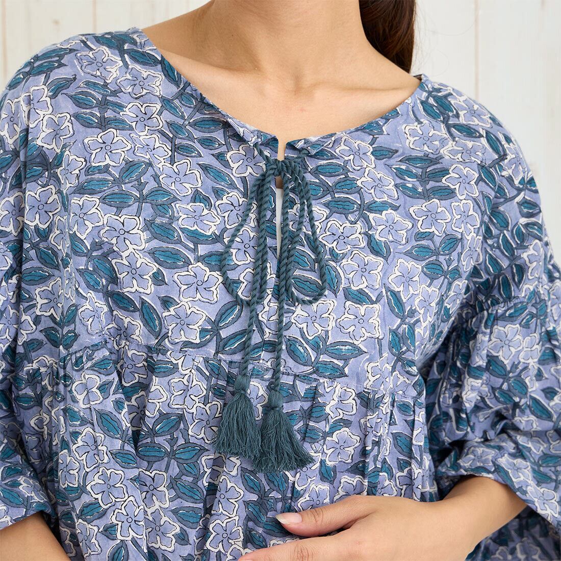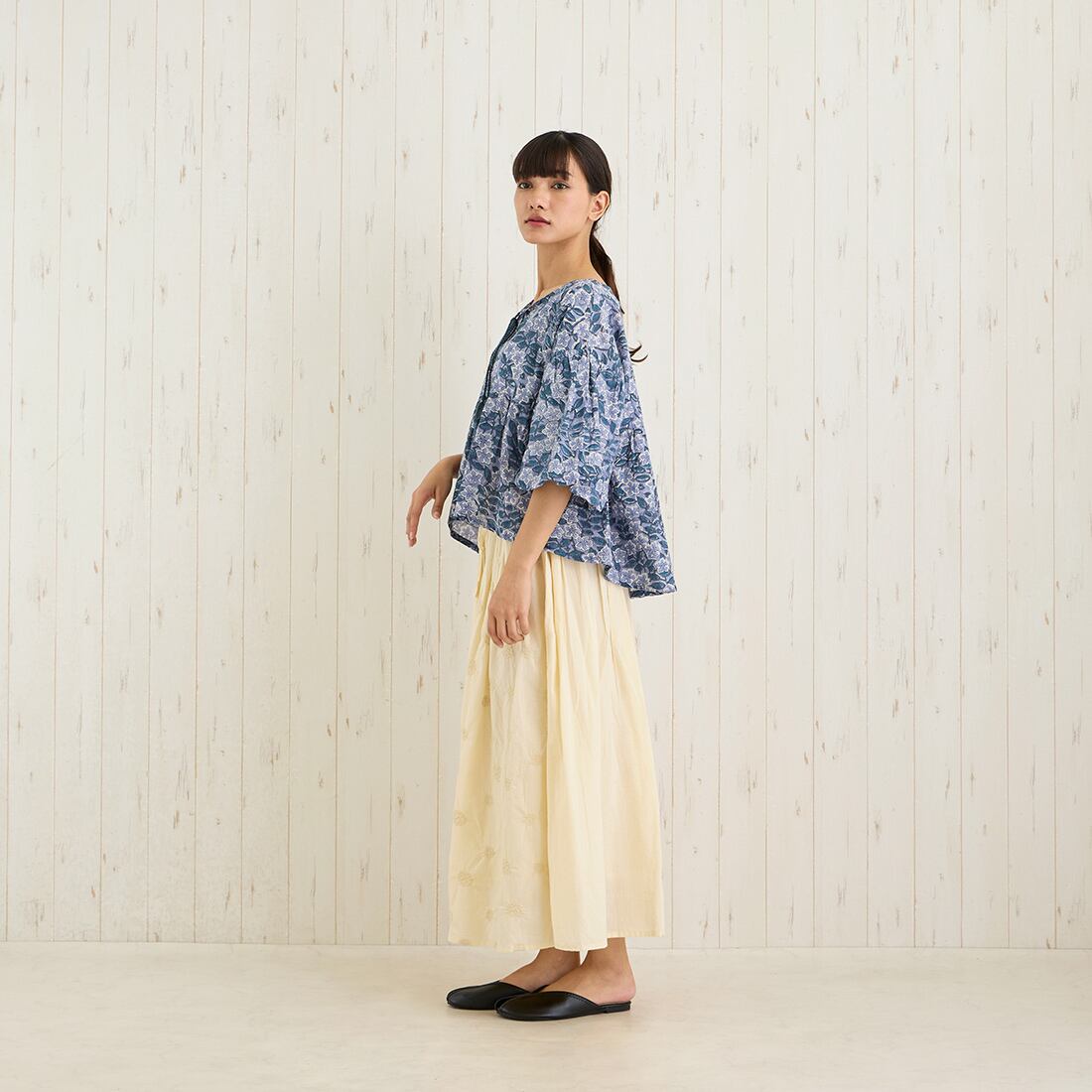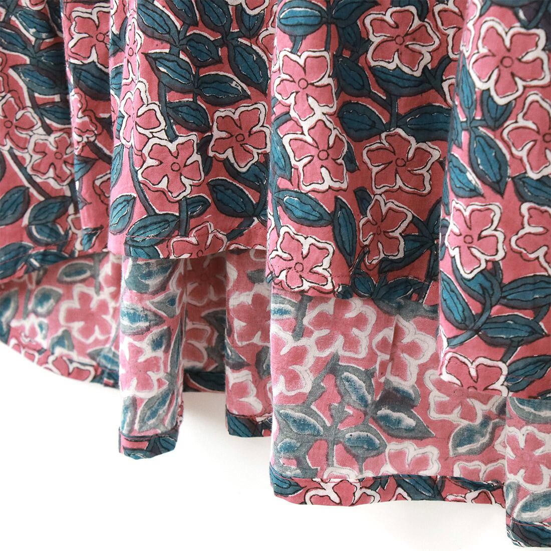 同系色のブロックプリントとふわりと広がる裾が上品。