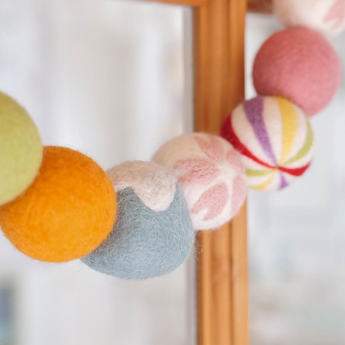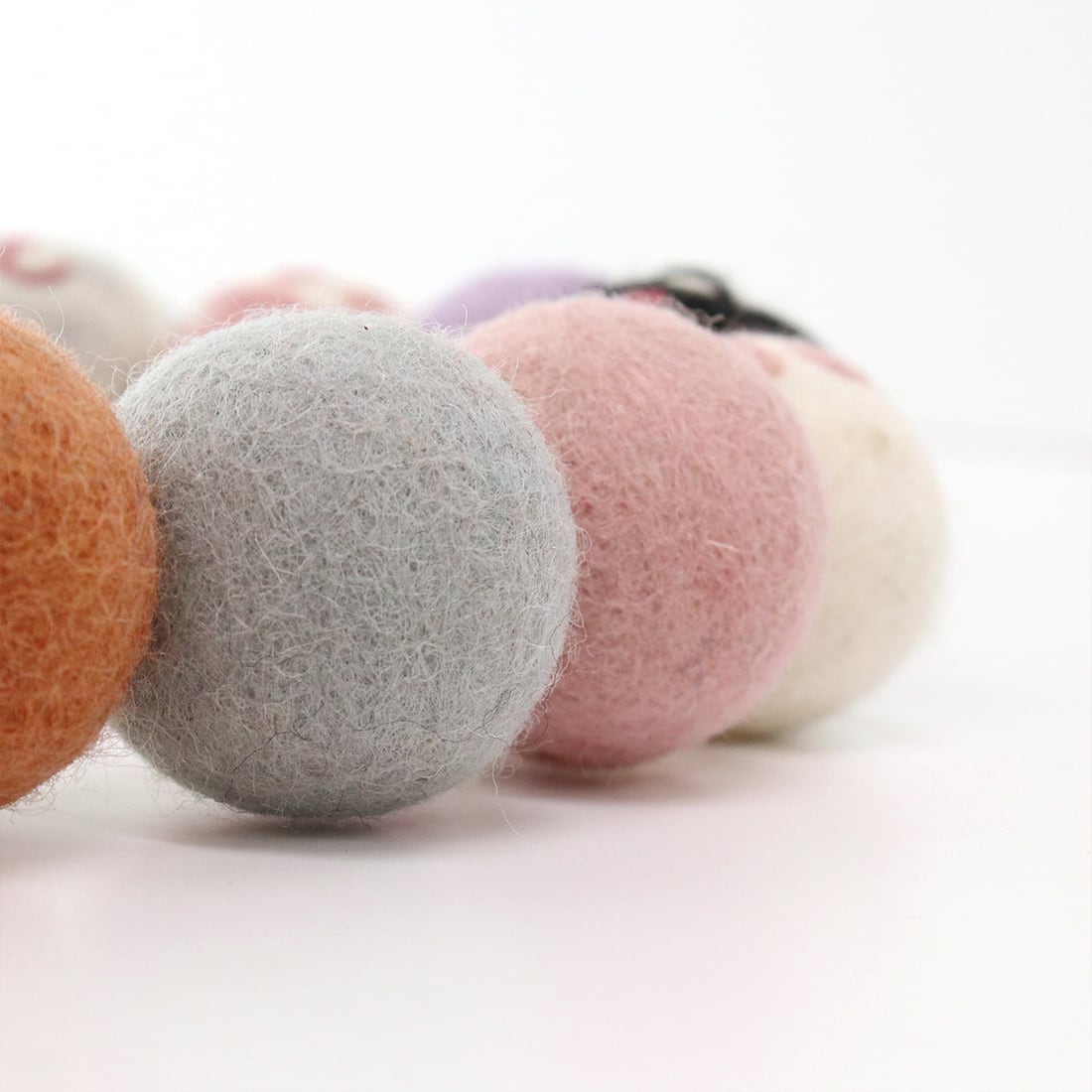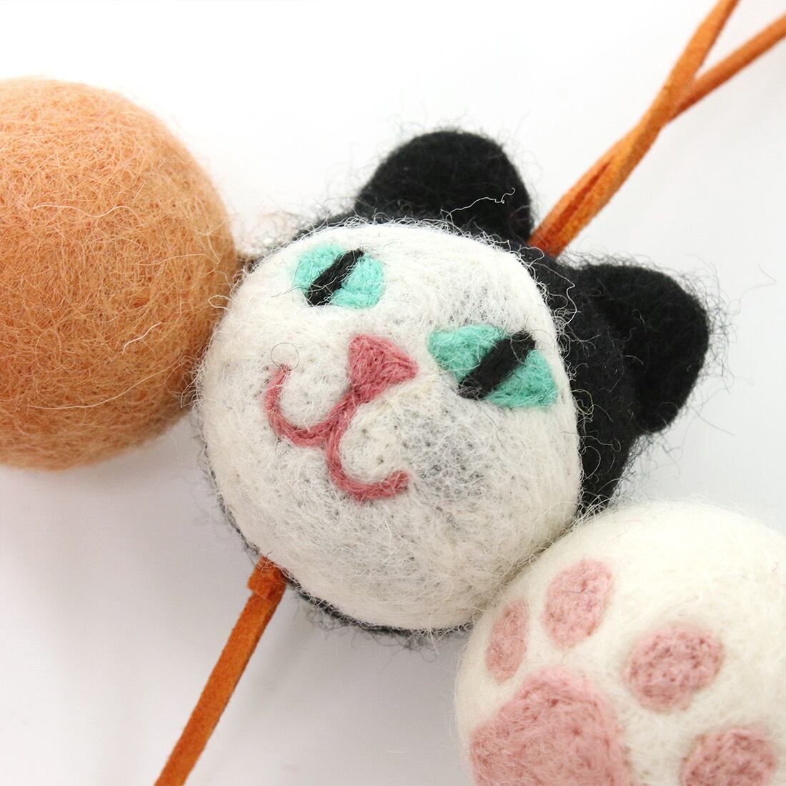 ヒツジの毛を広げて石鹸水などを含ませて、もんだり巻いたり転がしたりすることで作られます。
